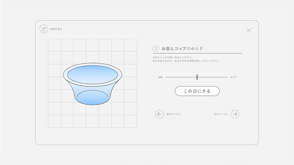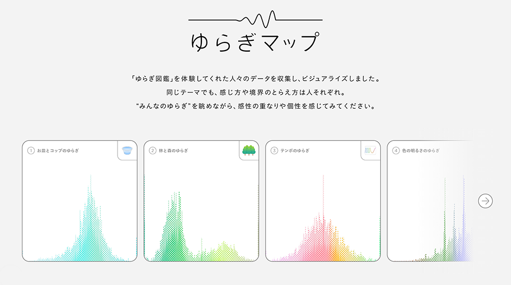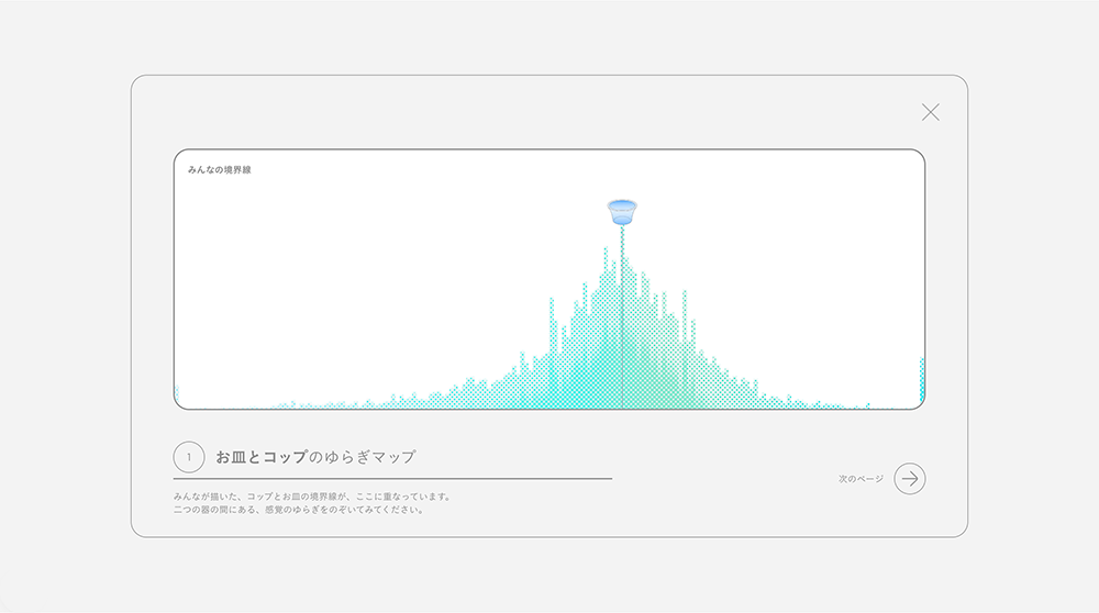 その第一弾コンテンツとして、 「お皿とコップの間」や「明るいと暗いの間」など、日常に潜む境界線を直感的な操作で探究する体験型コンテンツ「ゆらぎ図鑑」を制作した。さらに、ユーザーのゆらぎの結果を「ゆらぎマップ」として可視化。一人ひとりの感性によって異なる曖昧な”ゆらぎ”を見つめ、他者との違いや重なりを発見できる場を設計している。