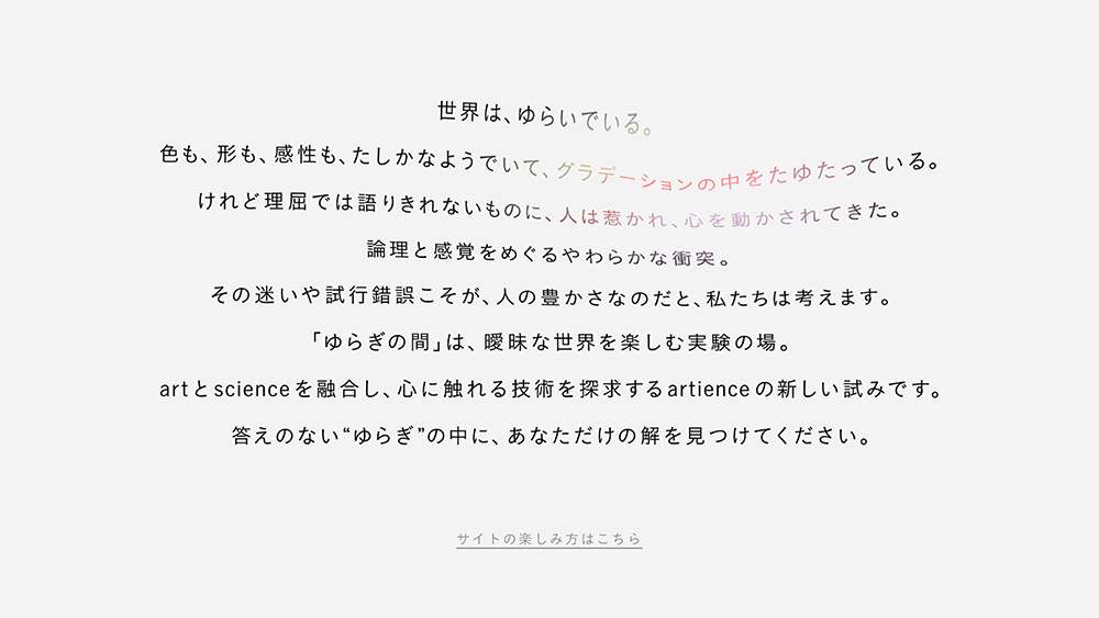 アートとサイエンスがそうであるように、物事の境界線は常に曖昧である。この曖昧さを「ゆらぎ」と捉え、二つが混じり合う「あわい(間)」に新しい価値が眠るという考えを体現。