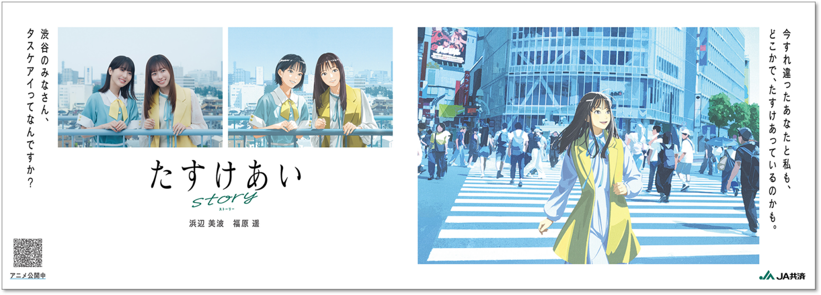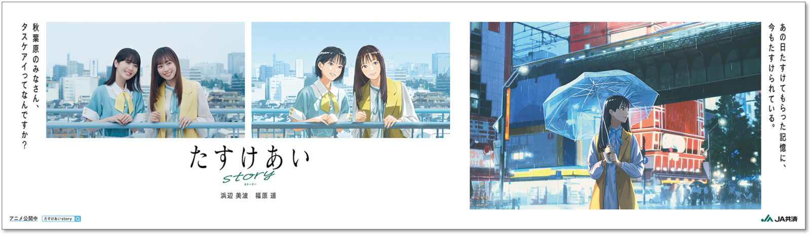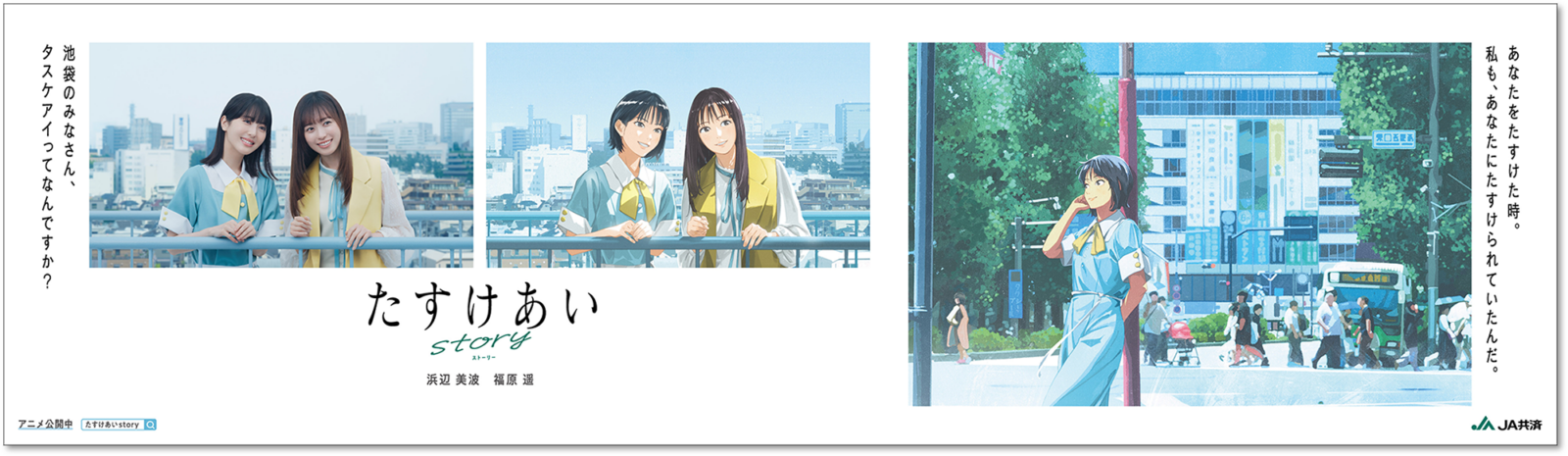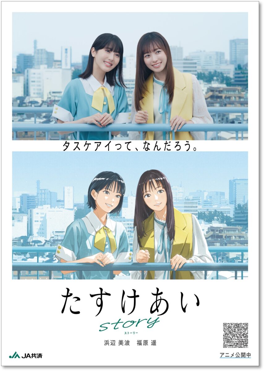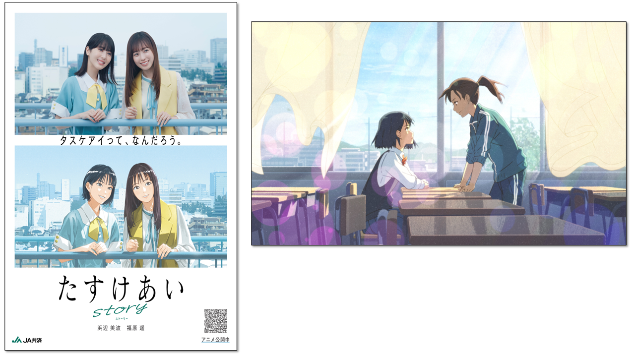 一般から「たすけあいエピソード」を募集し、契約タレントである浜辺美波さん・福原遥さんが出演するアニメコンテンツに。「タスケアイ」が失われた未来からやってきた未来人の依頼で、シリーズを通じて、二人が時空を移動し、タスケアイを集めていく。